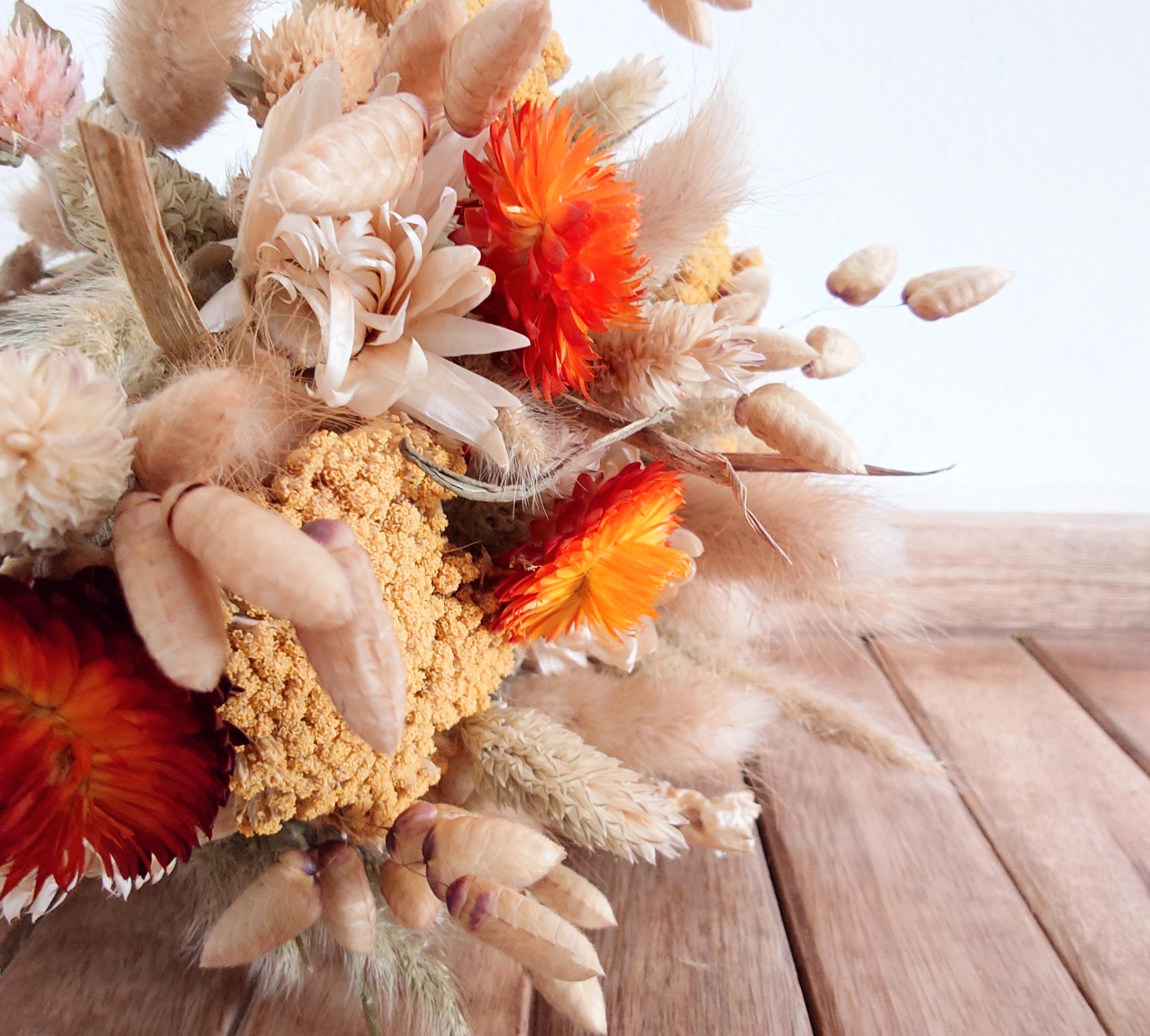 Beautiful dried flower bouquet in beige, orange and yellow.