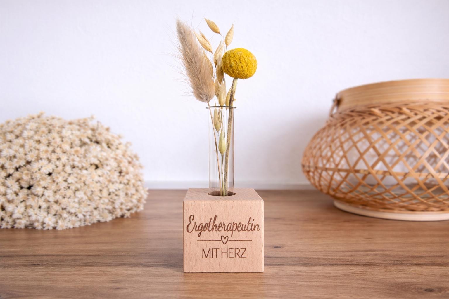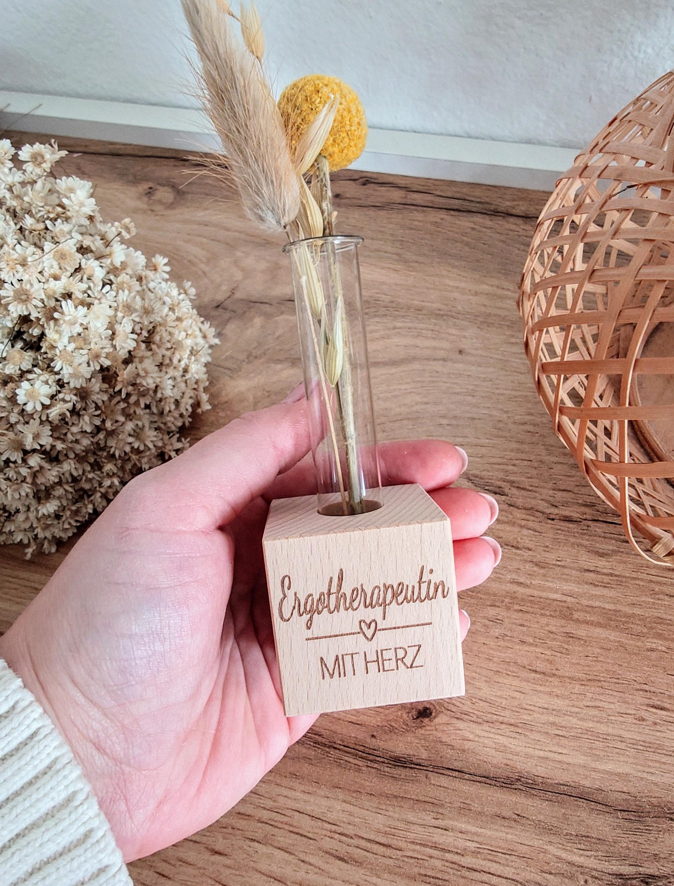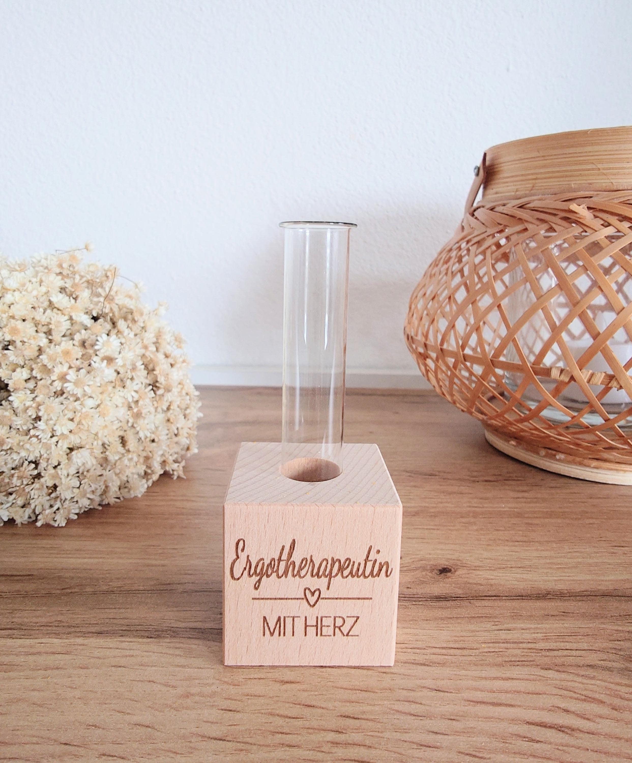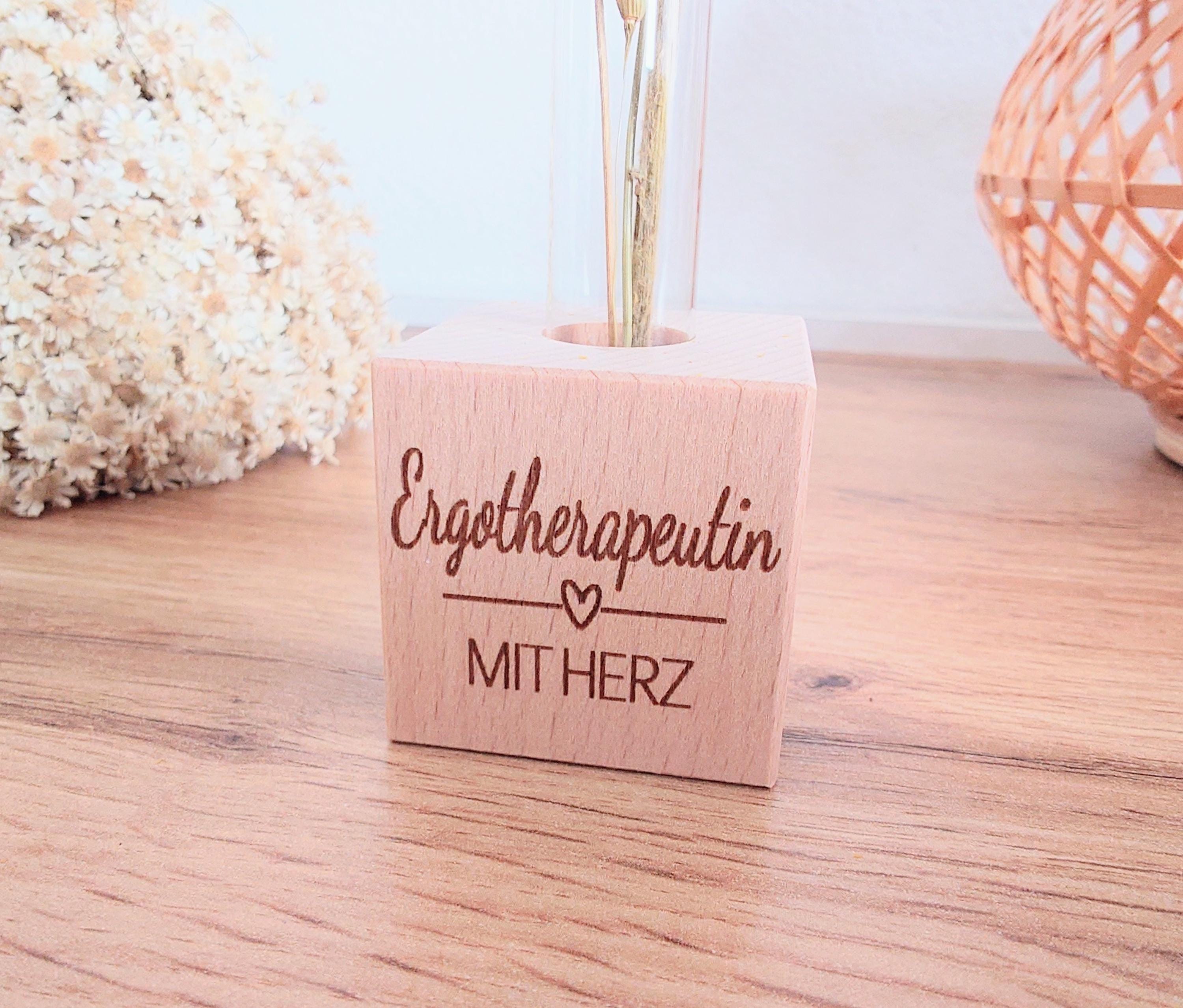 The sturdy beechwood stand is engraved with "Occupational Therapist with Heart" and holds a delicate glass test tube. Whether on a desk, in a therapy room, or at home – this decorative piece serves as a daily reminder of the value of this work.